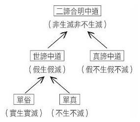 中國三論宗祖師吉藏提出「五句三中」的觀法,幫助修行人進行「中道真實觀」。五句中第一句執實有的生滅,是虛謬的世俗諦,只是偏執,故為「單俗」;第二句生滅不是我們看得那麼表面;如科學家認為「質能互換」;如宗教徒認為「輪迴投生」,是真實的世俗諦;但仍未看清現象,故為「單真」。第三句如小乘修行人見諸法緣起,唯於諸緣起法執為實有,故為「世諦中道」。第四句如法相唯識,離二取相,於「所取」及「能取」都無所得,唯執於究竟,故為「真諦中道」。第五句二諦合明中道;勝義諦為諸法無生之境,言語道斷,心行處滅,唯聖人以大悲心建立世俗諦向眾生說法,故仍可以心識概念表詮緣起真實義。這就是第三次中道;簡稱五句三中。